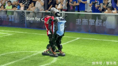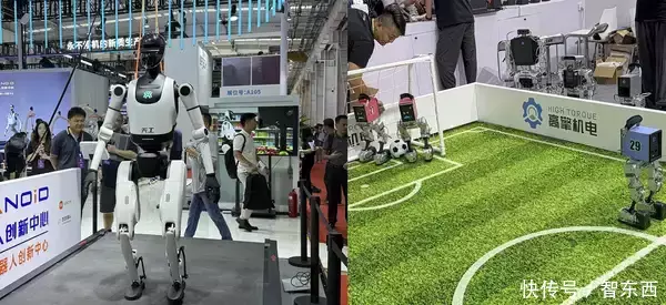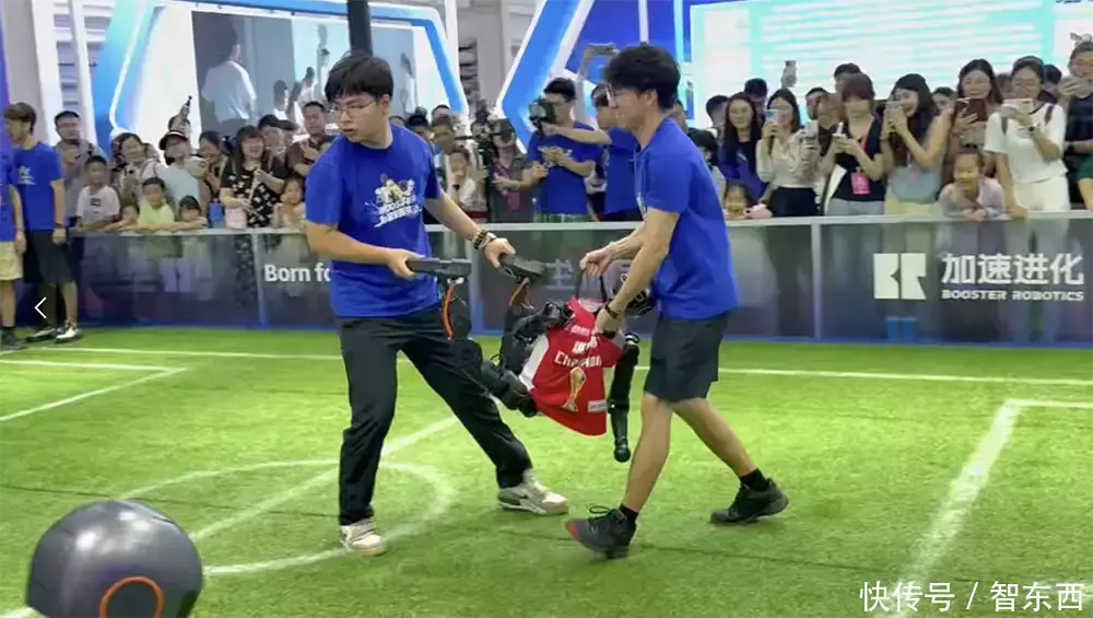 加速进化现场举行2v2足球赛,参赛机器人均为2025 RoboCup巴西机器人足球世界杯冠军机型加速T1,比赛采用无遥控、全AI自主决策模式,还有让观众与机器人组队协作的互动环节。