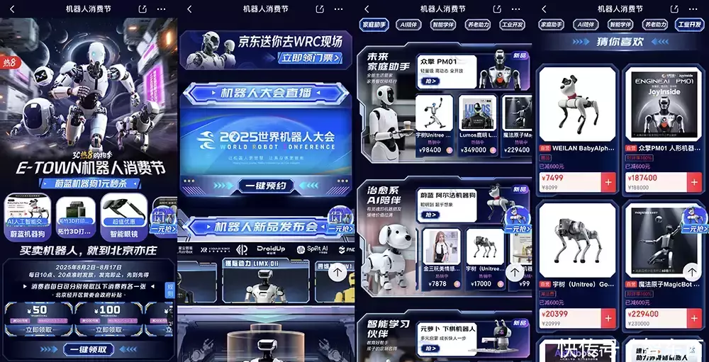 线上有京东机器人专区,线下世界机器人大会和机器人大世界展示并售卖包含41家参展企业的百余款产品,全球首个具身智能机器人4S店、智能机器人主题餐厅「机器人焰究所」、机器人大世界文创区都能用消费券享受优惠价。