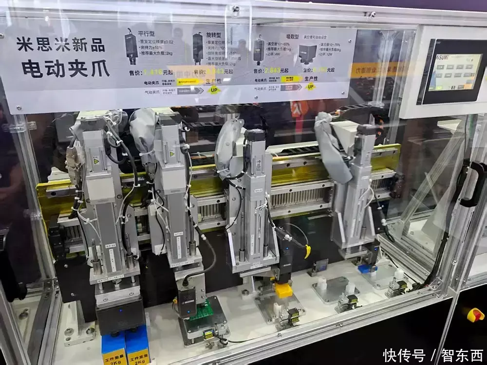 还有一些夹爪展品。比如米思米的电动夹爪,有平行型、旋转型、吸取型,售价从1416元到6163元不等。