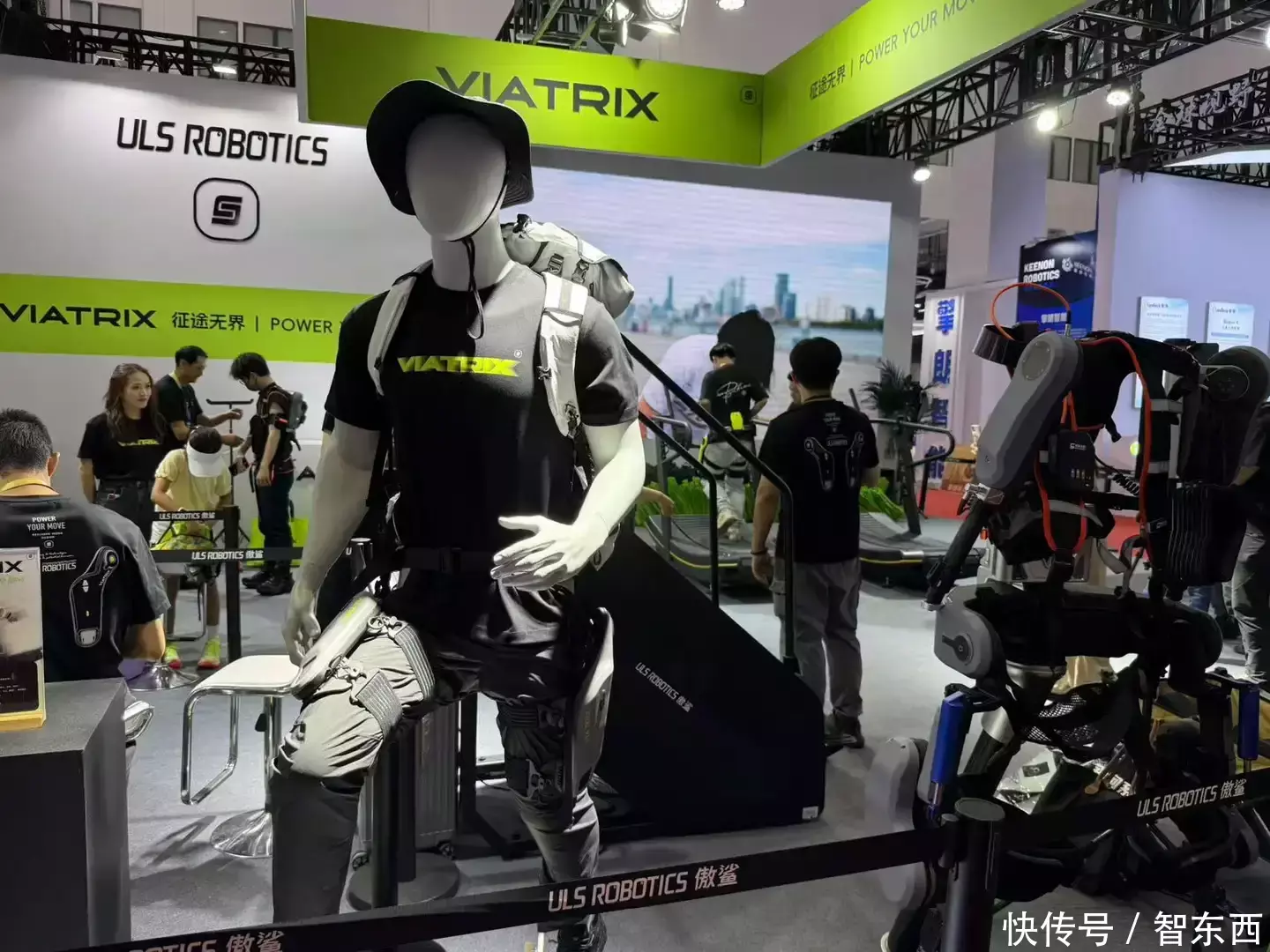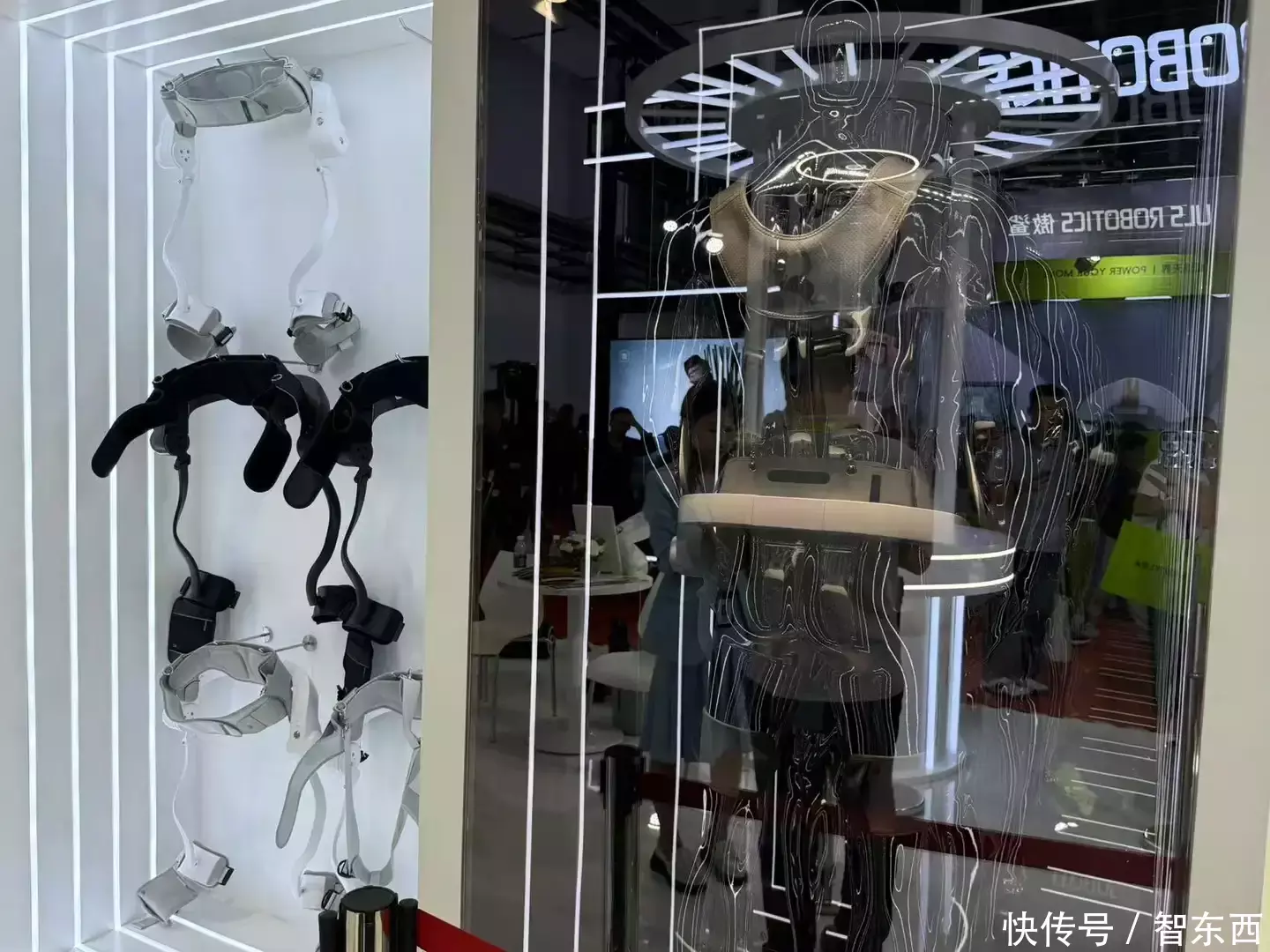 傲鲨智能的展台非常户外运动风,展出了多款上肢、下肢外骨骼机器人。观众可以试穿产品,进行爬楼梯、跑步、拿取几十公斤重物等体验。