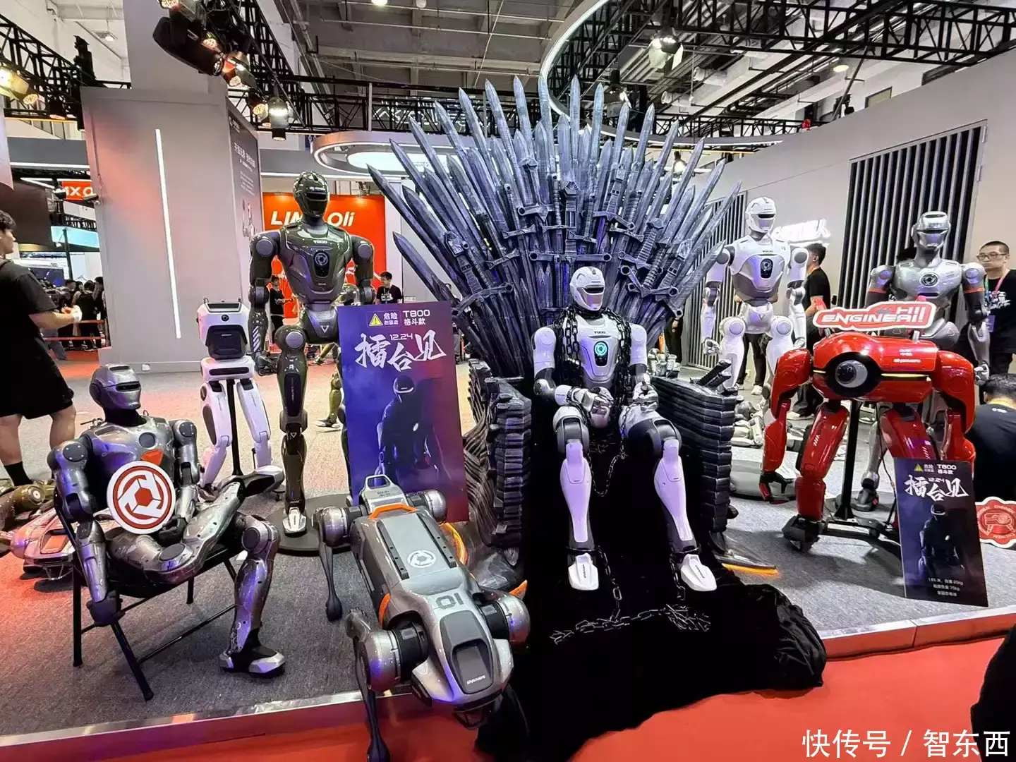 拥有1米85大高个的众擎重载级格斗机器人T800,则端坐在仿《权力的游戏》的铁王座上,被铁链缠身的造型霸气十足,不时还会抬胳膊秀力量。它将参与众擎年底举办的机器人格斗比赛。