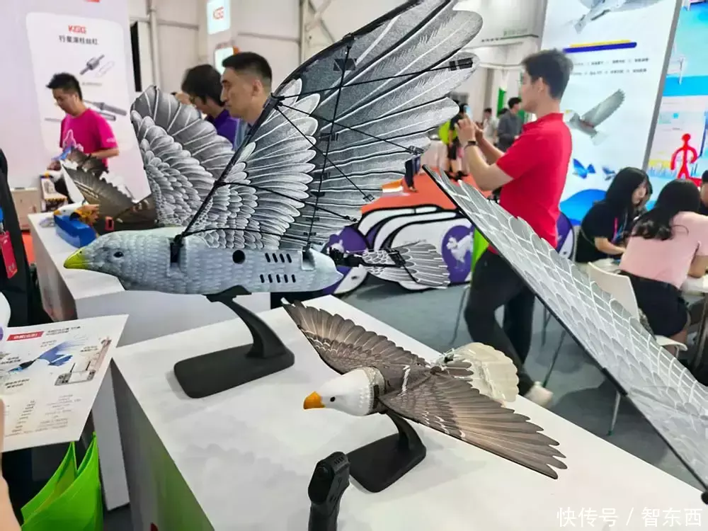 汉王科技的仿生机器鸟灵感源自金雕、猎隼等猛禽,现场进行了试飞演示,其扑翼、滑翔姿态都很自然,噪音很低。