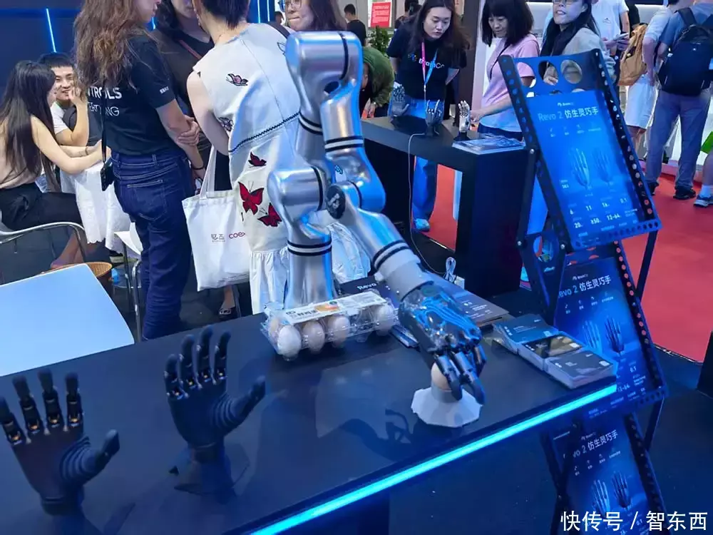 灵巧手展台的人气也非常高,配合机械臂执行夹鸡蛋、举铁健身、做实验滴试剂等动作,吸引了大量围观人群。大部分灵巧手展商都在C馆。