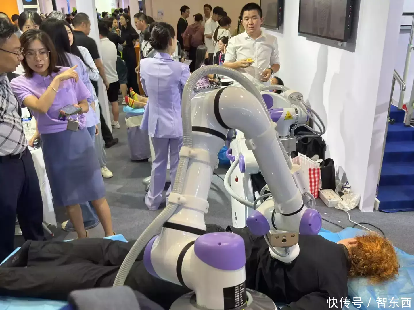 智慧康养展区展出了多台外骨骼机器人、按摩机器人,许多观众排队等按摩。