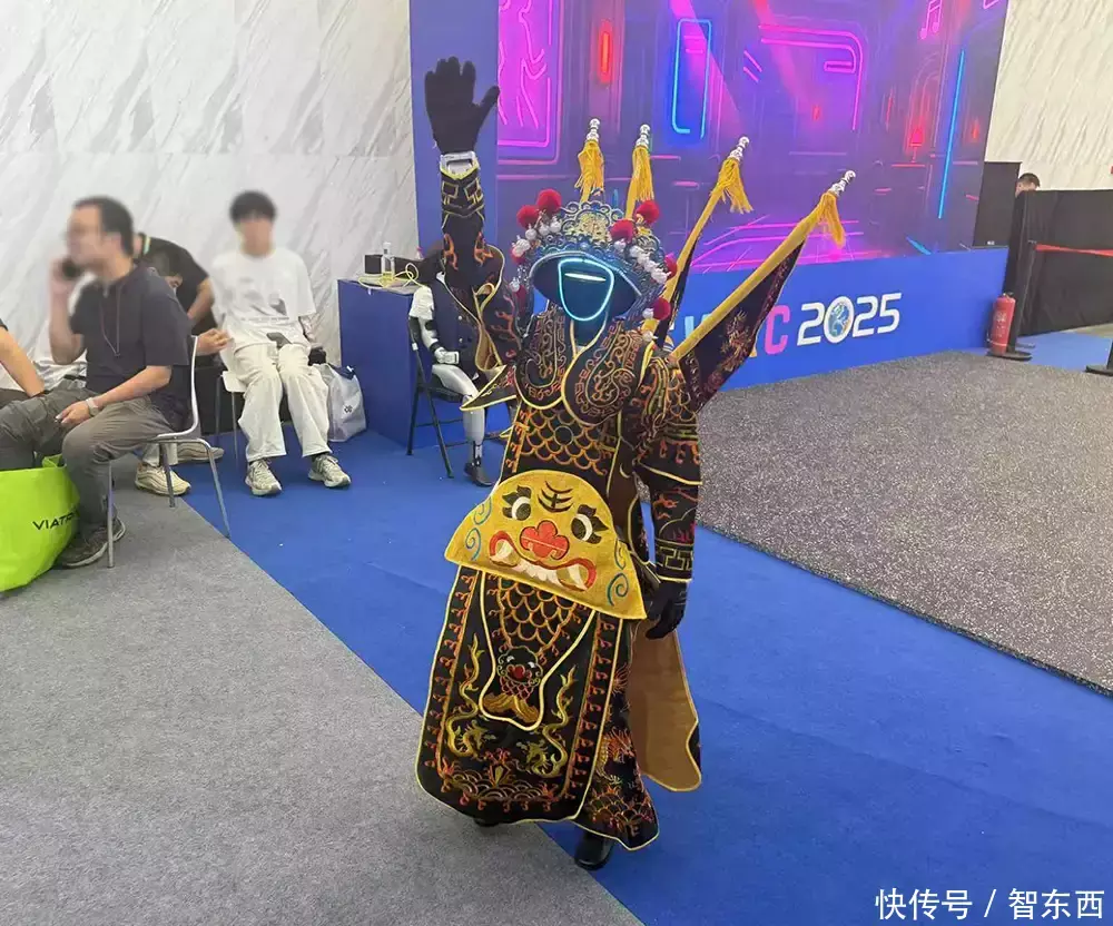 ▲京剧扮相的宇树科技机器人在展馆外对观众挥手互动