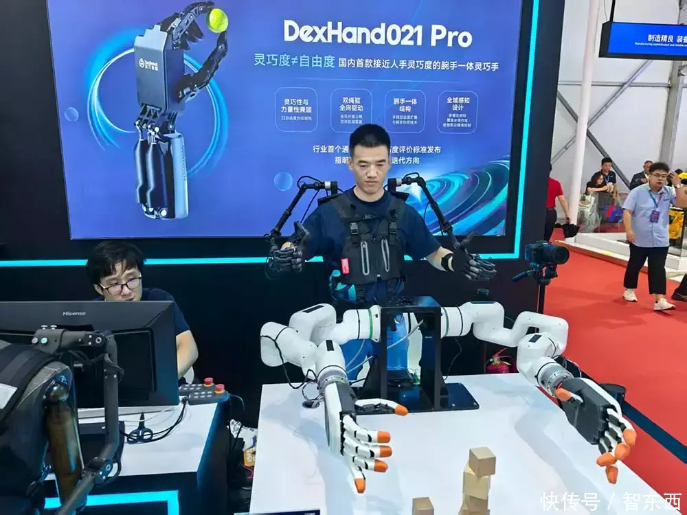 灵巧智能展出了国内首款接近人手灵巧度的腕手一体灵巧手DexHand021 Pro,搭配高精度外骨骼遥操作平台,采用22自由度仿生架构,成为首款可量化评估灵巧度的机器人手部模组。