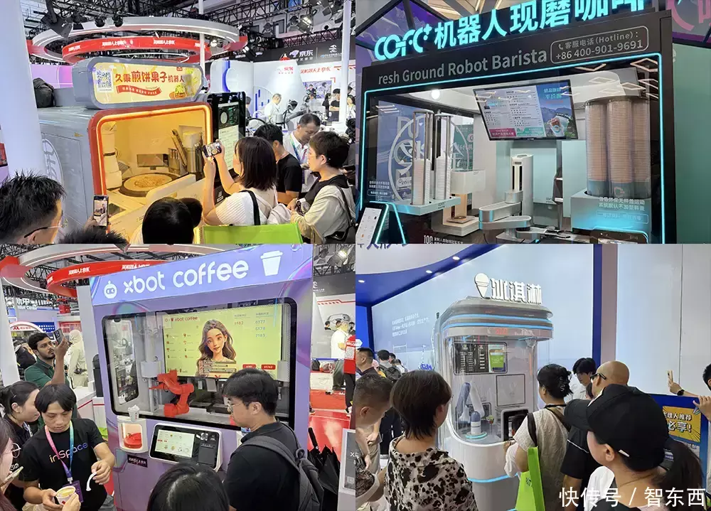 在展馆,随处可见非人形的服务机器人摆摊,做煎饼果子、拉花咖啡、冰激淋、爆米花。几乎每台机器前都大排长队。